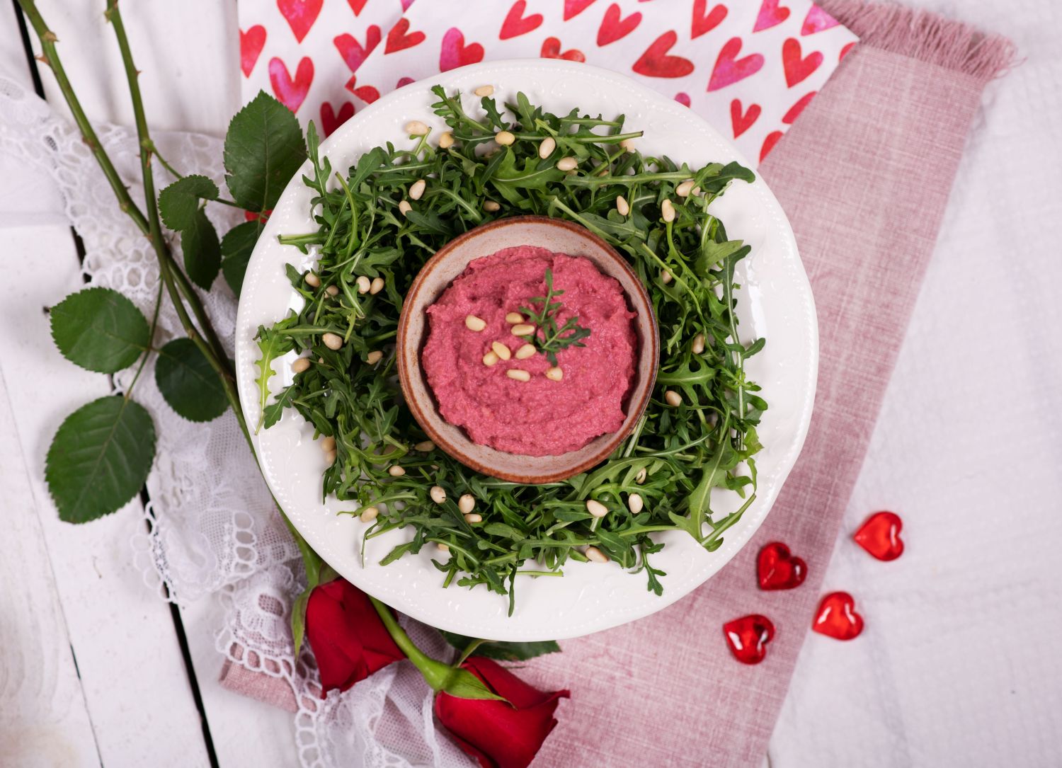 Jídelníček bude ve vyladěných růžových barvách a surovinách, které mohou mít vliv na vitalitu a chuť trávit svůj čas s protějškem. „Taková cizrna může povzbudit sexuální chuť a potenci. Oříšky jako mandle či pinie zase obsahují L-arginin, což je aminokyselina, která podporuje tvorbu oxidu dusnatého, a tím pomáhá rozšiřovat cévy a zlepšovat průtok krve,“ prozrazuje nutriční specialistka Mgr. Kateřina Šimková ze Zdravého stravování.